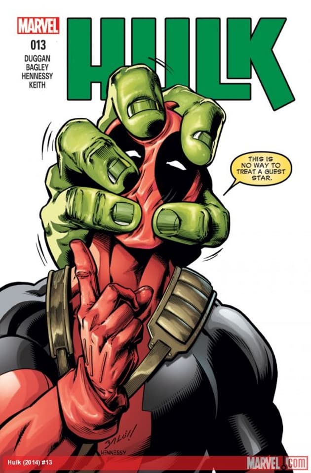 Si bien la franquicia de Hulk ha sabido tener siempre su propio estilo de portada, el hecho de que el elemento "Deadpool" sea introducido en esta ocasión, hace que la fórmula se desmorone en función de algo más... bueno... humorístico. La frase "Esta no es la forma de tratar a un invitado estrella" justifica cualquier ausencia de los elementos característicos que suelen adornar las portadas de esta serie. Muy hilarante.