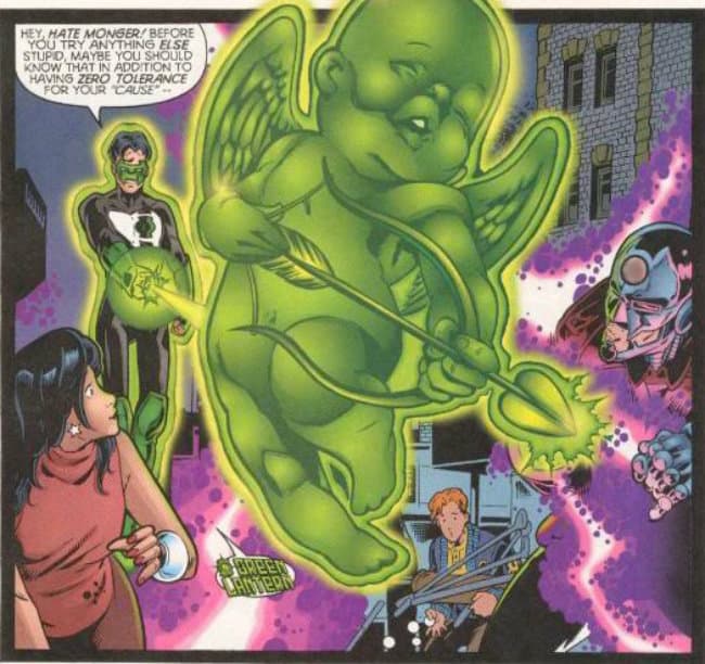 Está bien pensar que el poder del amor lo puede todo. Pero hacerlo tan evidente y real es extraño. En una aventura, Linterna Verde sale con una chica solo para ser sorprendido por un nazi. Para combatirlo hace un ángel del amor de proporciones muy grandes.