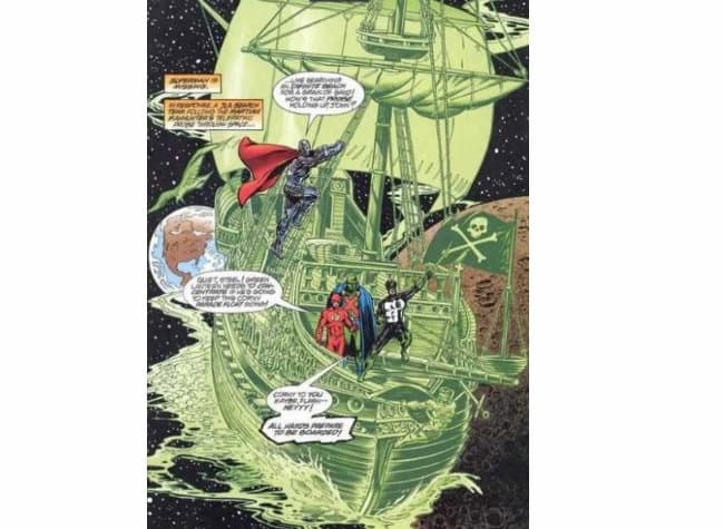 Así que sería verdaderamente tonto crear un barco pirata gigante (con detalles y hasta un Superman a la punta) solo para transportar a sus amigos superhéroes al espacio. Además, si ya va a crear un barco, es innecesario hacer el mar, las olas y las aves al rededor.