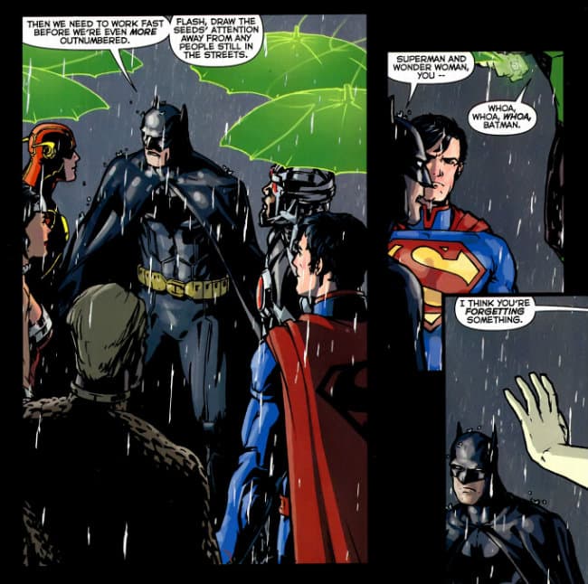 Cuando llueve sacas uno y te cubres del agua. Lo entendemos. Sin embargo, personajes como Superman o Cyborg han vivido cosas tan extremas que un poco de lluvia no debería molestarles. Lo mejor es Aquaman diciendo que él no necesita taparse del agua.