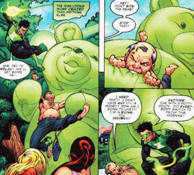 La manera más absurda de atrapar a un criminal debe ser la de este momento. Para parar a un ladrón de bolsos Linterna Verde elige usar un oso gigante de peluche. Nunca lo hubiera pensado yo. Es decir, ¿por qué no cualquier otra cosa para detenerlo? Habiendo un sinfín de opciones...
