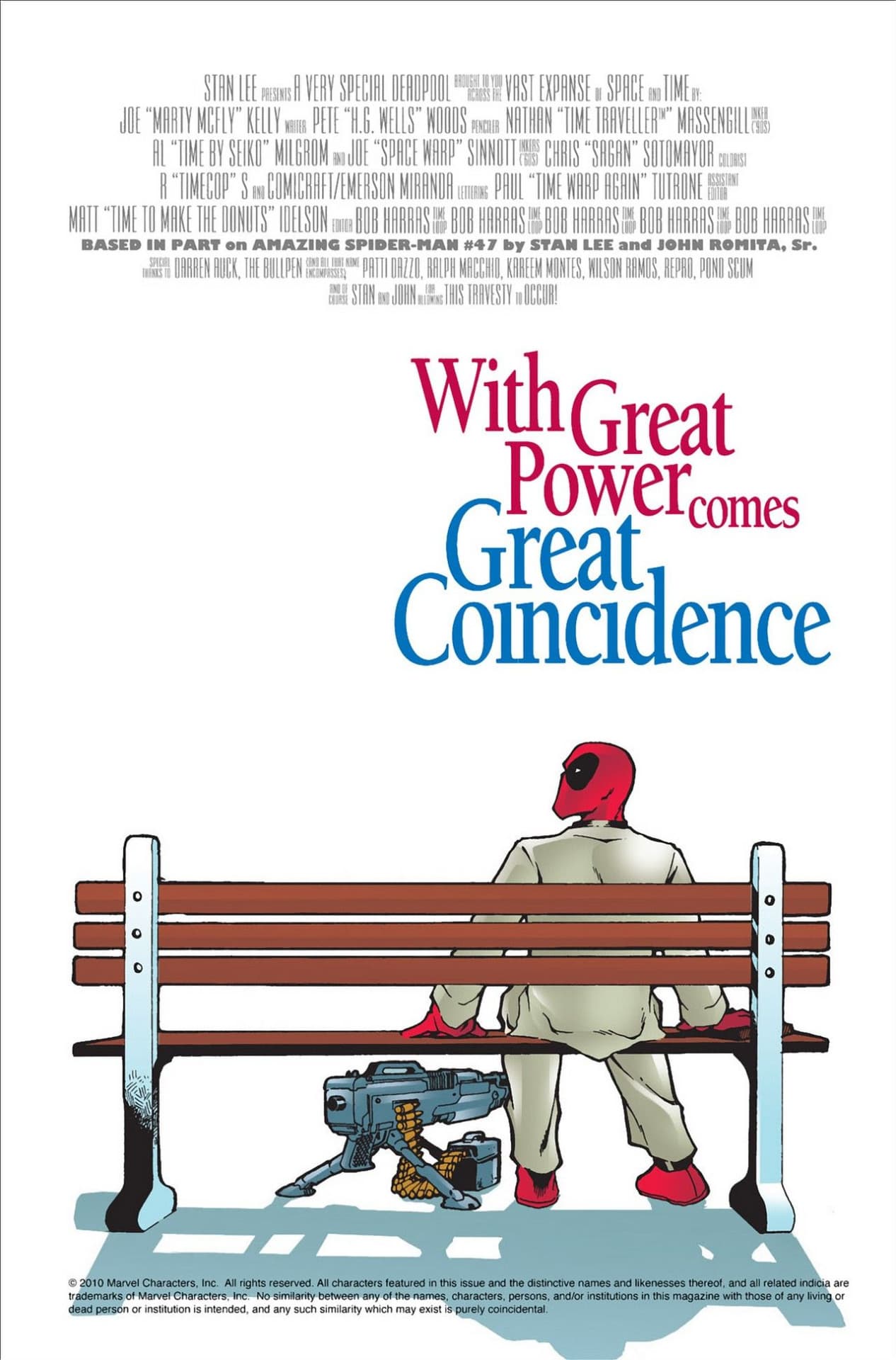 No es secreto para nadie que Deadpool es una serie principalmente absurda, y Joe Kelly lo lleva a otro nivel en esta historia. En With Great Power Comes Great Coincidence, Deadpool y su compañero de cuarto son transportados a un número clásico de The Amazing Spider-Man, específicamente el número 47 de 1966. Una vez ahí, Deadpool usa un holograma para hacerse pasar por el arácnido, causando un caos absurdo sobre el cómic original.