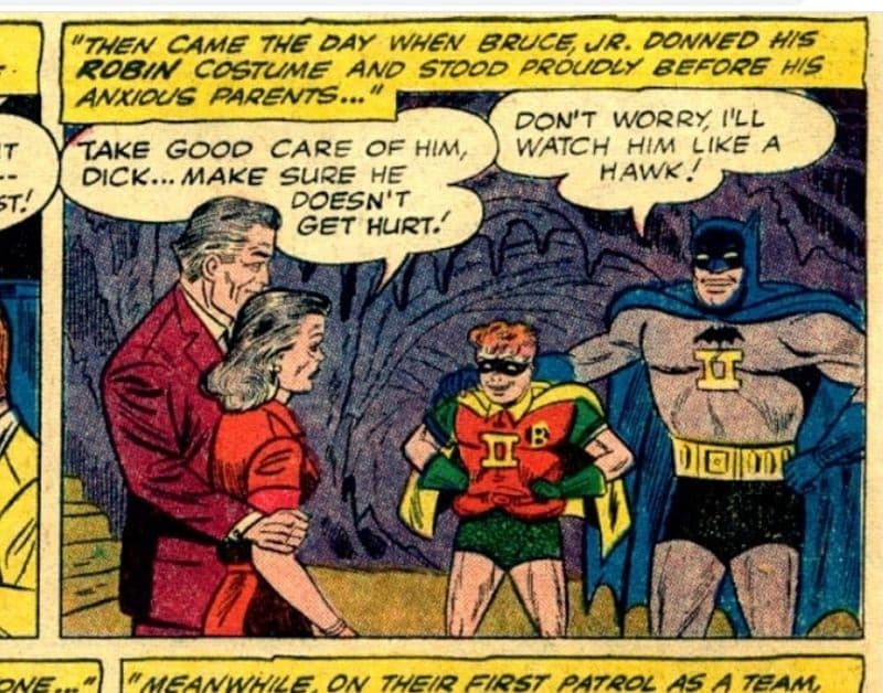 Se trata de Bruce Wayne Jr, quien en Batman (1960) #131 apareció en una historia en que se imaginaba el futuro, Bruce se retira y Dick Grayson se convierte en Batman 2, mientras que el hijo de Bruce y Kathy Kane se convierte en el segundo Robin.