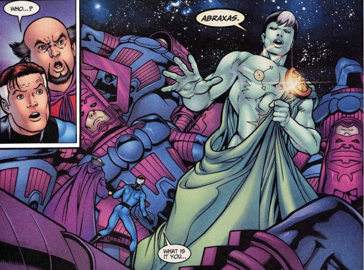 Abraxas nació cuando el multiverso se dividió, y con el objetivo de detenerlo, Eternity creó a Galactus.