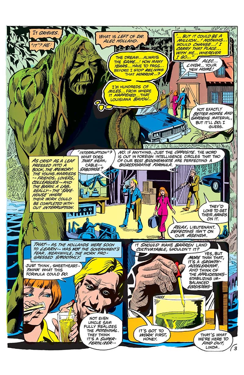 En los cómics, la historia de Swamp Thing es bastante conocida; Alec Holland es un científico que tiene su laboratorio en un pantano, ya que está desarrollando la fórmula biorrestauradora para tratar los sembrados y fortalecerlos contra un extraño virus.