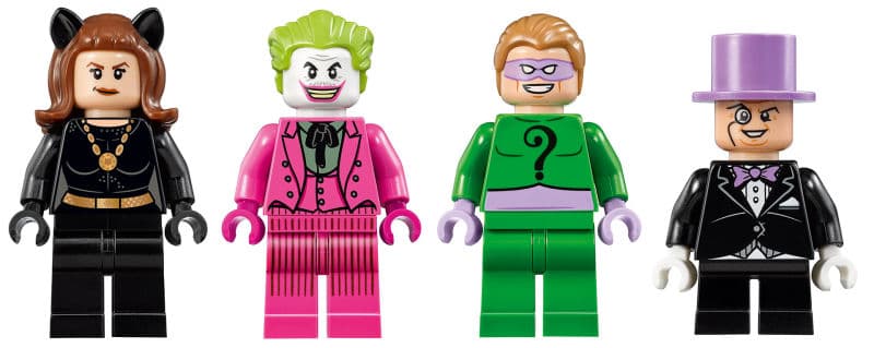 El set tiene exactamente 2,526 piezas, además de 9 figuras, de las cuales 4 son villanos icónicos. Podrás tener la versión LEGO de la serie de los 60 de Catwoman, El Acertijo, Joker, y El Pingüino. Además viene con Batman y Robin en sus disfraces característicos, así como las versiones de los alter egos, Bruce Wayne y Dick Grayson (Bruno Díaz y Ricardo Tapia en Latinoamérica). El set no solo tiene la baticueva, sino un batimóvil, el helicóptero y la motocicleta. Por si fuera poco, incluye un pedazo de la Mansión Wayne con todo y pared para escalar muy a la Batman del 66. Al igual que en la serie, el batiteléfono rojo está presente, así como los batitubos para que los héroes se puedan deslizar. Los últimos se encuentran ocultos atrás de los libros y se activan con un interruptor en el busto de Shakespeare.