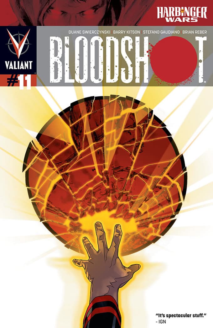 Las guerras de Harbinger continúan en Bloodshot #11, Angelo Mortalli (vaya que fueron creativos con el nombre) lucha por mantener a salvo a los pequeños sobrevivientes del Project Rising Spirit, aún contra sus voluntades. Desde la sombra amenazan dos ejércitos secretos, ¿qué podrá hacer este súper soldado?.