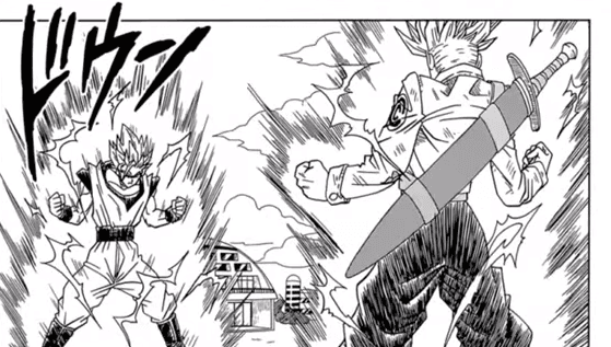 En el manga, el poder de Trunks SSJ2 superaba al de Gokú SSJ3, por lo que Gokú tuvo que transformarse en SSJ Blue momentáneamente.