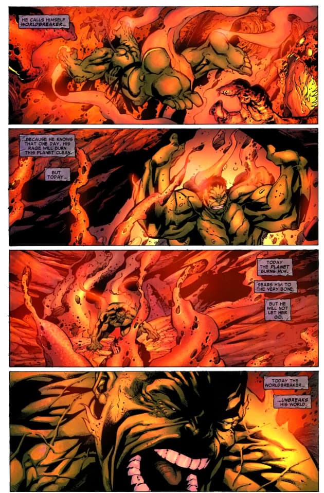 Una vez que el Rey Rojo de Sakaar se da cuenta de que detener a Hulk es imposible, decide poner en marcha un plan de destrucción masiva que seguramente acabará con el planeta, y todos los que están sobre él: activa un dispositivo que sencillamente divide las placas tectónicas de Sakaar, y en cualquier instante partirá al planeta en pedazos. En uno de los momentos más épicos de su carrera, Hulk decide hundirse en un río de lava, y a pura fuerza de voluntad (y muscular) logra volver a unir las placas y salvar a su nuevo planeta.