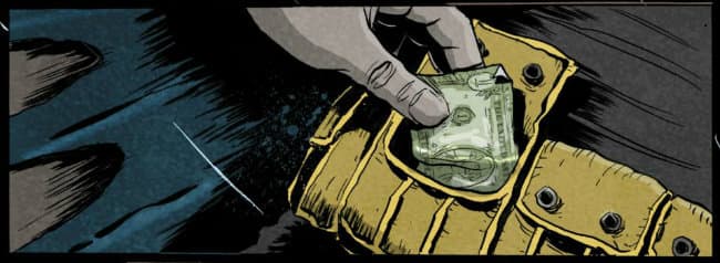 Pero eso es lo de menos, ya que se acerca a tomar el dólar que apostaron. Lo saca del baticinurón. Un momento, voy a decir eso otra vez para clarificar. Batman tiene un dólar en su baticinturón (por si algún día necesita comprar algo en el camino o requiere de cambio para el autobús o no sé) y Alfred simplemente lo saca y gana la apuesta.