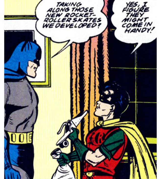 Pues Robin los pidió en una aventura y, para alcanzar al villano, se utilizaron. No son exactamente del baticinturón, ya que un par de patines es demasiado grande. Sin embargo, los jets sí salen de éste y se adhieren a los patines para una propulsión máxima. Bueno, Batman siempre contó con una agilidad que hasta le permite... ser un experto patinador.