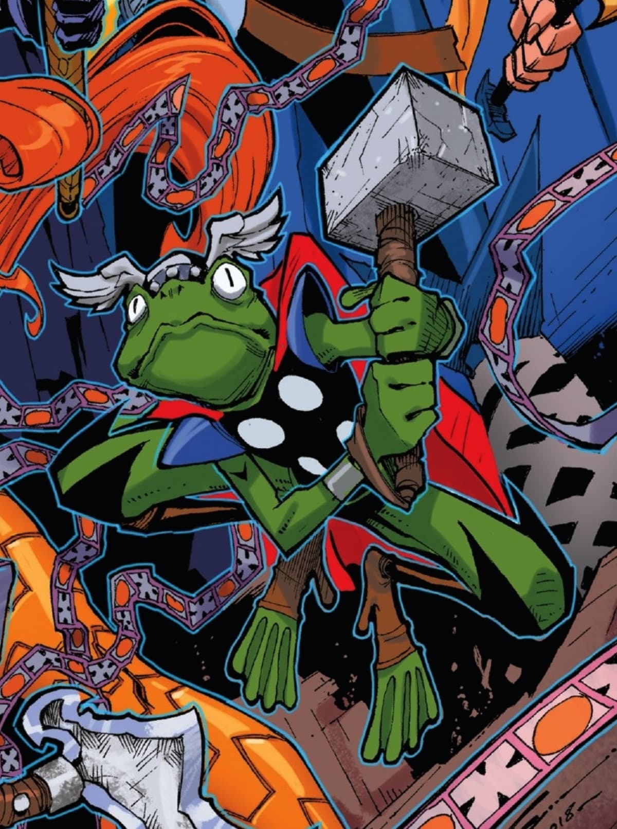 El Mjolnir, el poderoso martillo de Thor, solo puede ser levantado por alguien digno, sin importar su sexo o su raza. Durante una aventura, Thor se convirtió en una rana y ahí conoció a otro humano en su misma situación.