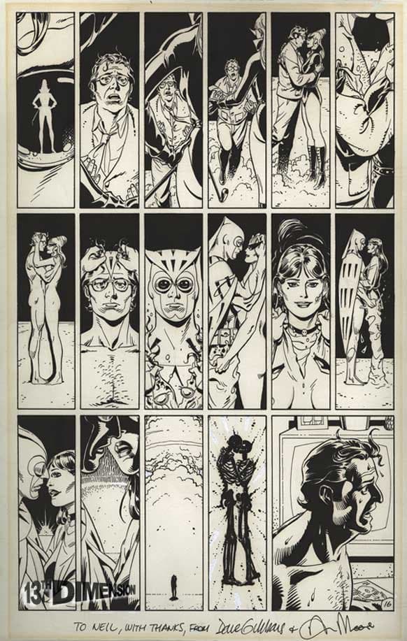 Como agradecimiento por su colaboración, y en homenaje a su incipiente trabajo, Alan Moore y Dave Gibbons le regalaron una pieza de su trabajo original para Watchmen. Se trata de la secuencia onírica de Nite Owl, relacionada íntimamente con el interés de Gaiman por el mundo de los sueños. La imagen es cortesía de sitio amigo 13th Dimension, si desean ver más por favor sigan el enlace.