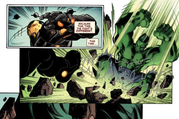 El argumento de Original Sin nos develó que Tony tuvo cierta responsabilidad en el accidente de Banner, lo que propició el último antecedente de batallas entre estos dos personajes. La personalidad de Hulk en este combate se muestra particularmente inteligente y en control de sus facultades, lo que le permite esquivar las clásicas trampas que Tony le pone por delante.