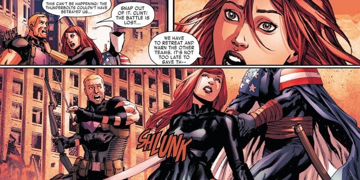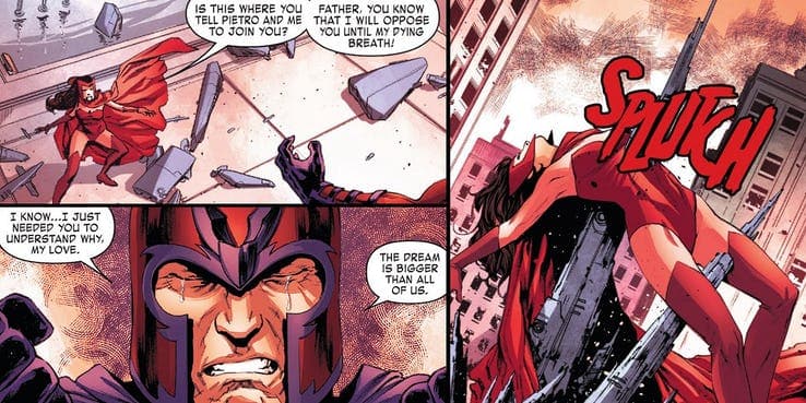 De esta manera, Scarlet Witch (que es asesinada por Magneto, su propio padre), Quicksilver, War Machine, Thor, Falcon, y Black Widow encontraron su fin. Hawkeye quedó como único sobreviviente debido a su pasado como miembro de Thunderbolts.