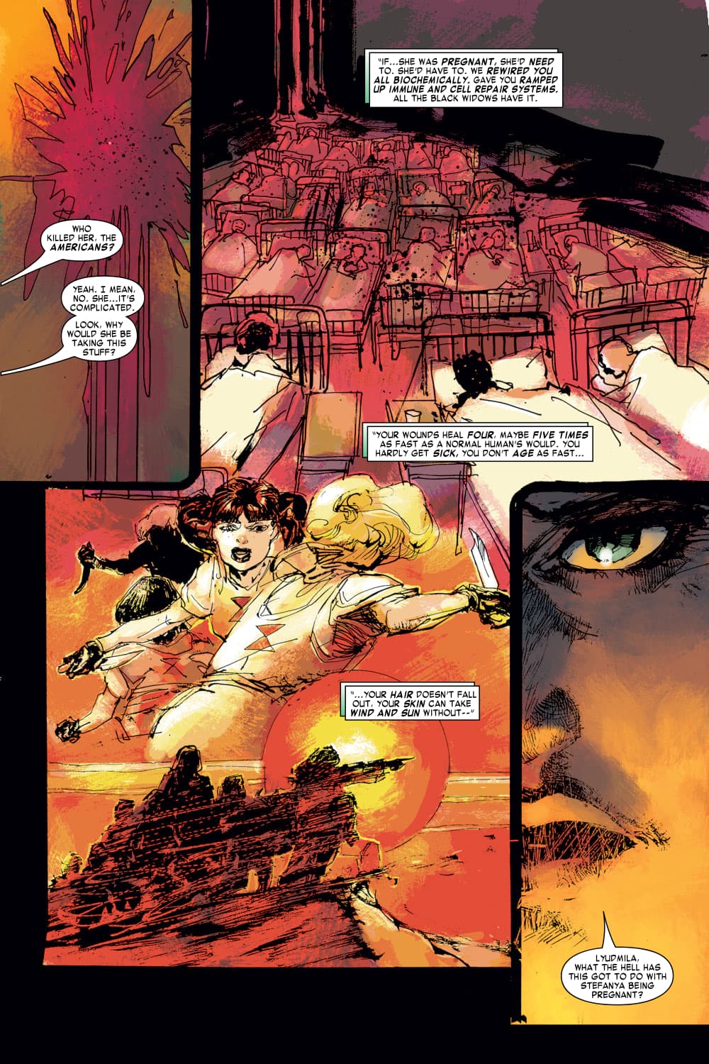 Otro de los orígenes de la Viuda Negra fue revelado en Captain America Vol 5, en donde Natasha Romanov fue entregada desde muy pequeña al proyecto Black Widow.