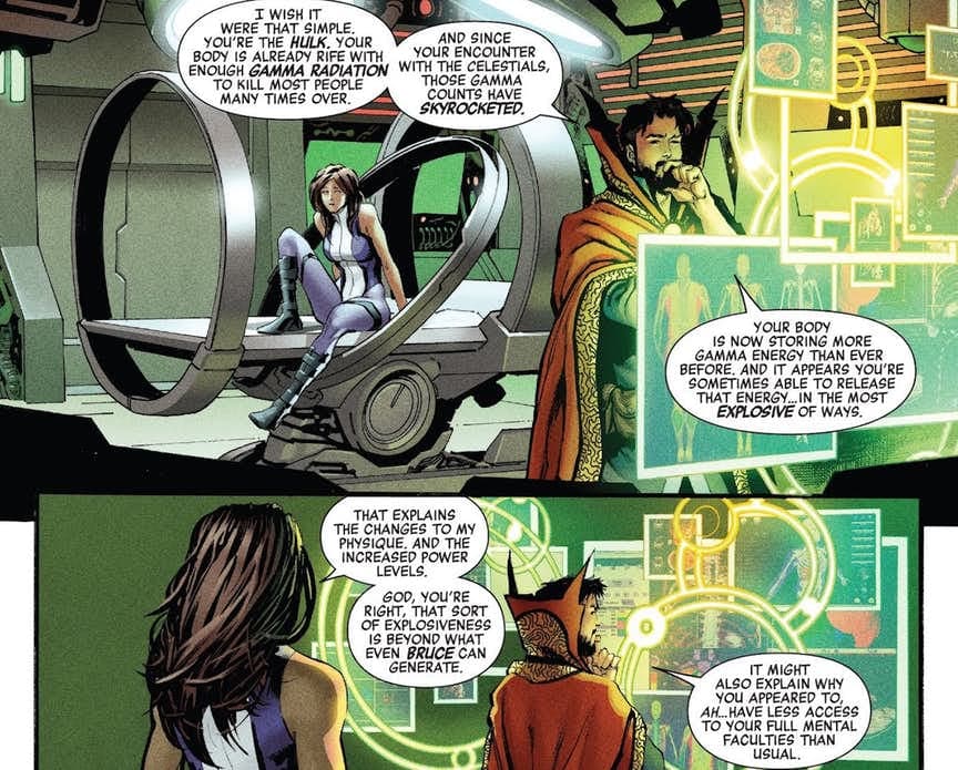 Según la investigación que realiza Doctor Strange combinando ciencia y ocultismo en Avengers #8, Jen Walters es ahora uno de los seres más poderosos del universo, aunque desafortunadamente esto tiene un alto costo…