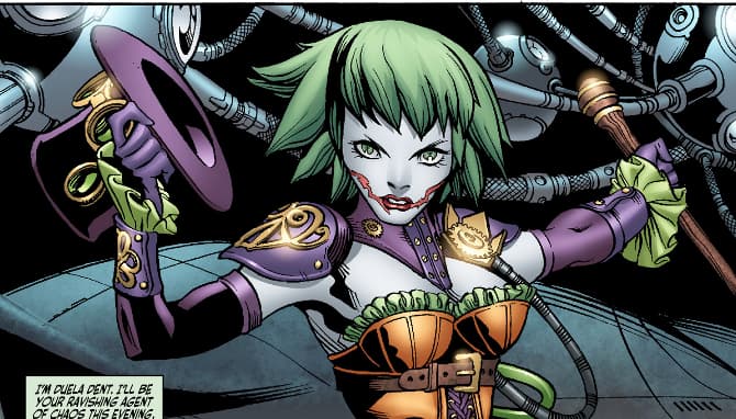 Dato adicional: En Tierra-3 su padre era Jokester (héroe contraparte de Joker) y Three-Face (contraparte de Two-Face), y su padrastro fue Riddler. Según muchos, esta Duela Dent posee la capacidad para saltar realidades.