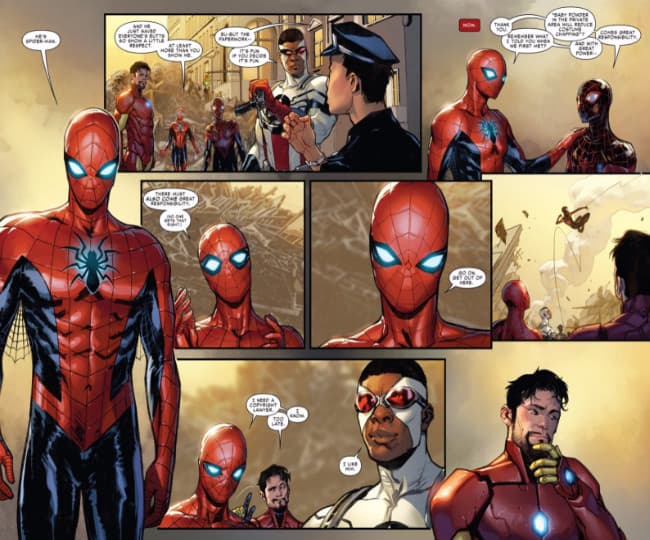 El momento más increíble del ejemplar de 2016, Spider-Man #2, es la manera en que Parker defiende a Morales. Cuando un policía no sabe ni quién es el muchacho disfrazado, Spider-Man (Parker) reacciona rápido y le dice " él es Spider-Man. Muéstrale respeto. Al menos un poco más del que a mí me muestras". Esto sorprende a Morales, quien después agradece a su mentor. Parker le dice la frase de su tío y lo deja ser un superhéroe también (y bajo el mismo nombre). Después bromea y menciona que va a necesitar un buen abogado de derechos de autor.