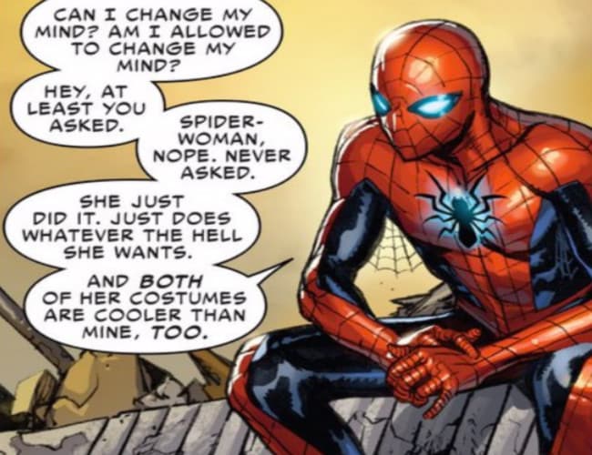 Le sigue una reflexión, actual, de Peter Parker. Autoriza que Morales sea Spider-Man también. Pero, ¿realmente está a gusto con ello? Entre sus comentarios, expresa consigo mismo que al menos Morales preguntó por su aprobación. Se lo pidió. Spider-Woman nunca pidió y solo se puso a salvar el mundo bajo el mismo nombre (o casi el mismo nombre). Se cuestiona si es muy tarde para cambiar de parecer. ¿Se permite que cambie de parecer? Adicionalmente, ambos cuentan con trajes más impactantes que el suyo, de acuerdo con sus palabras.