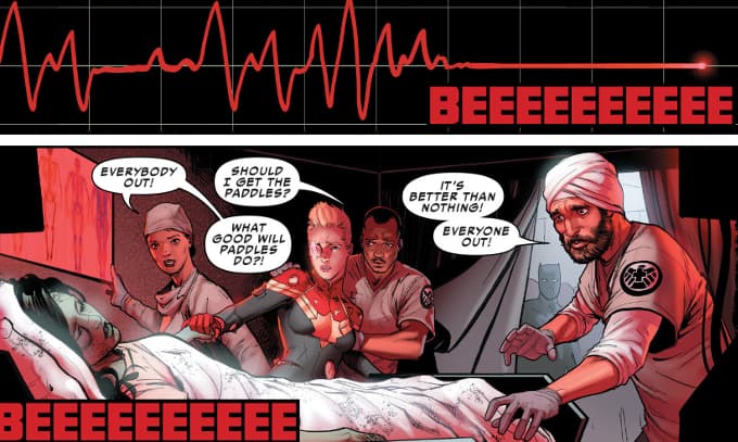 She-Hulk queda comatosa y es llevada al hospital, en donde es imposible tratarla, ya que el personal no posee los conocimientos biológicos necesarios para brindarle ayuda. Poco tiempo después, fallece frente a una impotente Captain Marvel; insistiendo, aún en su lecho de muerte, con lo importante de su misión, pidiéndole a Carol que continúe con su tarea.