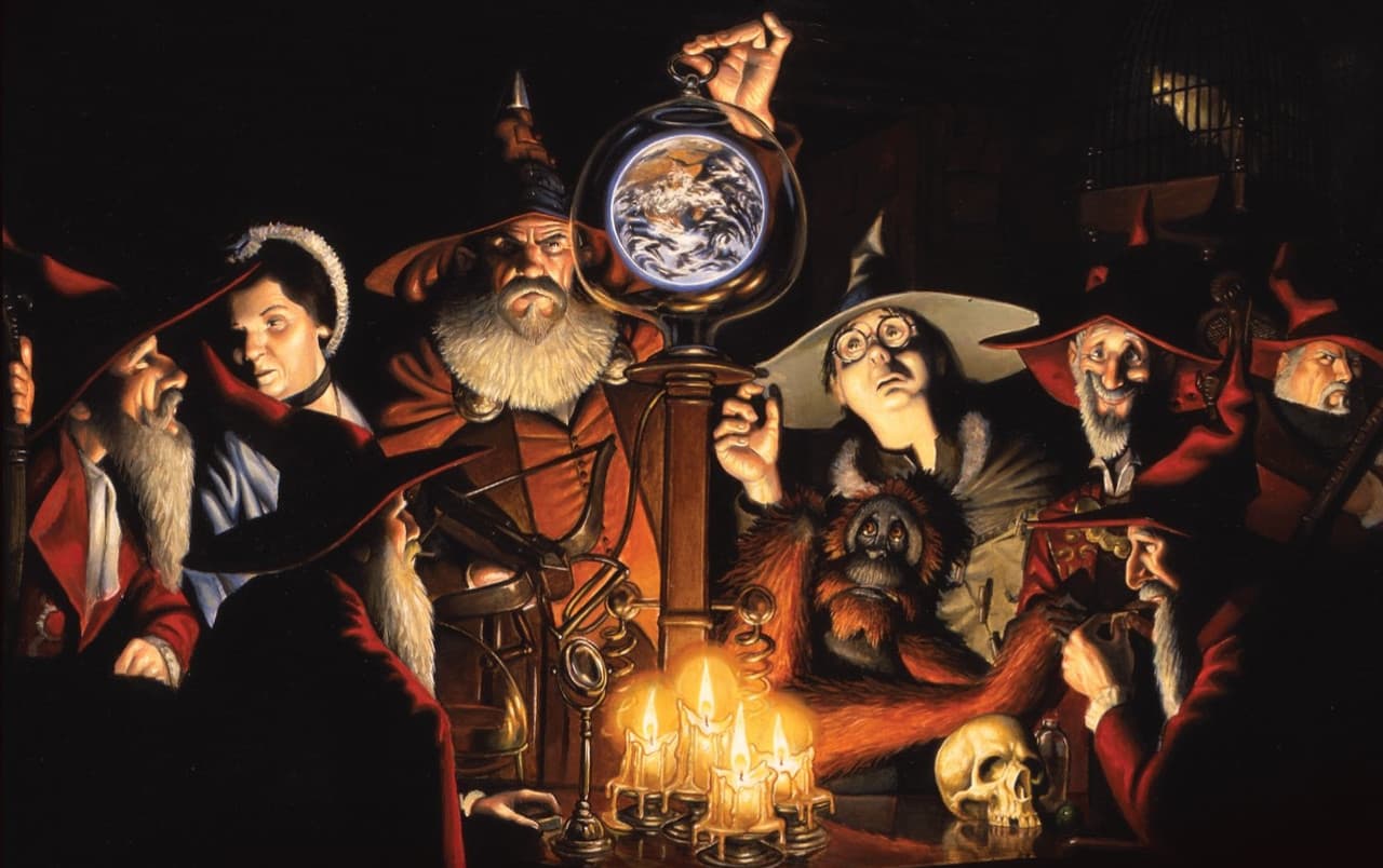 - Arco de los magos: cuando hablamos del arco de Rincewind, el mago que no hace magia, mencionamos a la Universidad Invisible. El claustro de esta universidad es un grupo de simpáticos viejecitos ociosos con demasiado tiempo libre, a los que cada dos por tres les toca salvar al universo de horribles destinos en los que seguramente ellos tuvieron que ver desde un principio. De todas maneras, suelen no tener tanto tiempo libre puesto que entre sus 17 o 18 comidas diarias suelen entretenerse confabulando unos contra otros, como buenos viejos amigos.