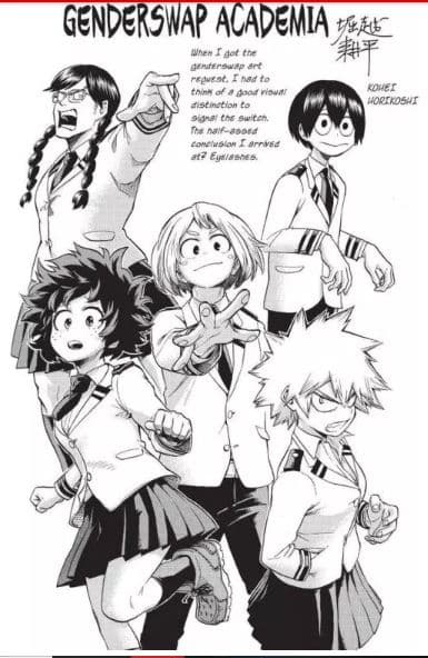 Como un pequeño detalle del creador del manga, Kohei Horikoshi, se revelaron unos bocetos de algunos de los personajes principales: ¿cómo serían si fueran del sexo opuesto? Hay que admitir que Lida se ve algo tenebroso e igual de intenso que siempre.