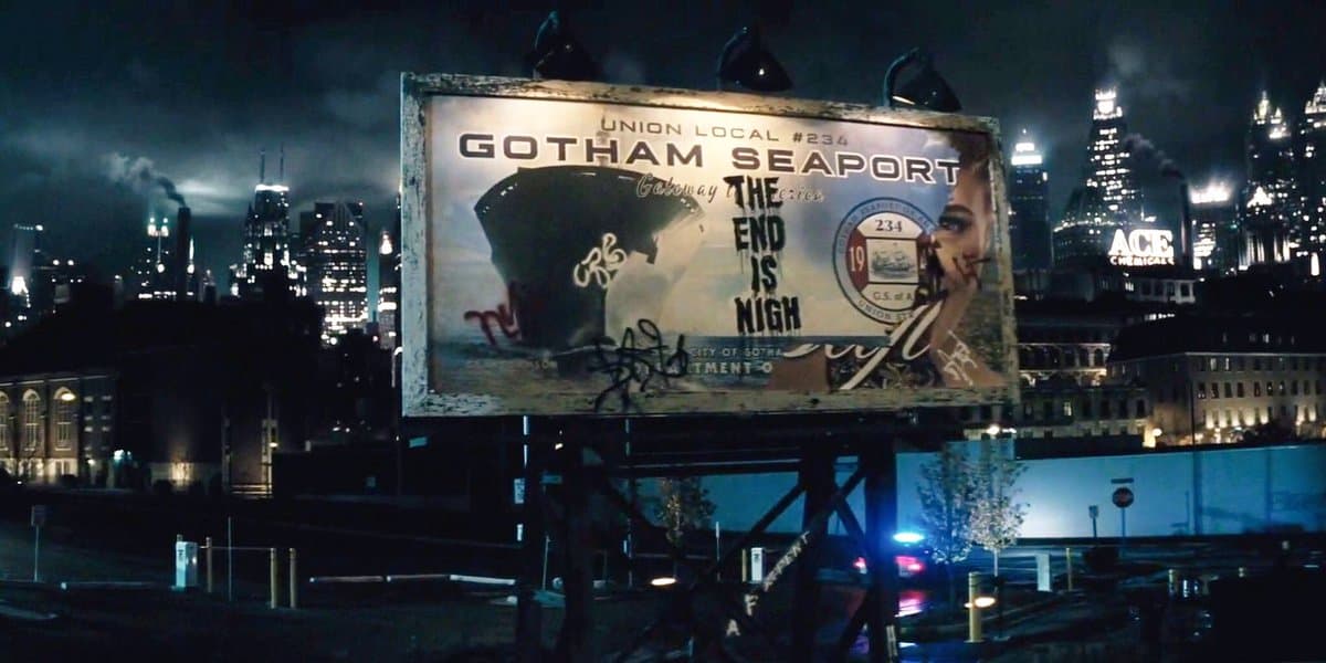 Luego de que los oficiales antes mencionados atienden a la llamada de alerta, se puede ver claramente inscripta en una valla publicitaria la frase “ The end is nigh”, recordada por pertenecer al mensaje que Rorschach siempre llevaba en Watchmen.
