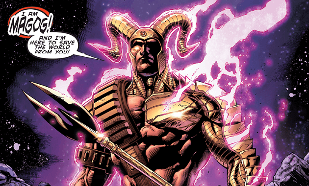 Creado para la miniserie fuera de la continuidad Kigdom Come (1996); tanto por su apariencia como por su nombre, Magog es una referencia al “ídolo falso” que se menciona en el antiguo testamento (el becerro dorado). Es presentado tanto como perturbado anti-héroe y como un temible villano debido a la manera extrema en que actúa, atacando tanto a otros villanos como a héroes por igual, aunque siempre buscando el bien común.