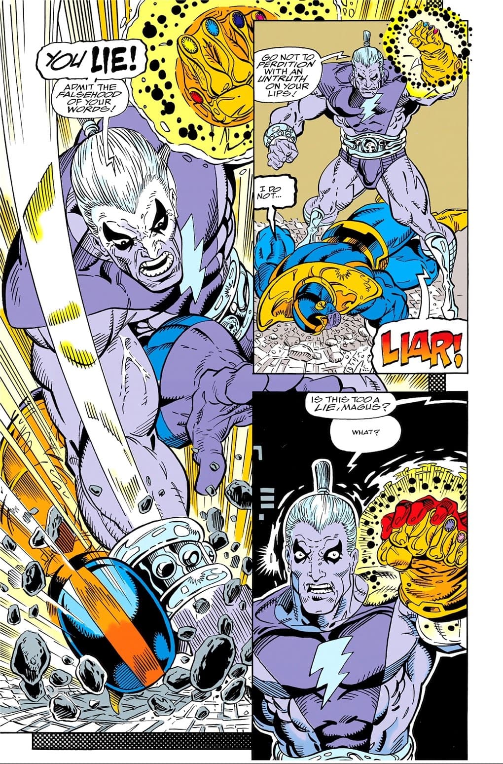 Varía de historia a historia. La primera vez que consigue todas las gemas del infinito fue en el cómic Infinity war, donde vence a todos los héroes de Marvel con el poder de las gemas; después derrota a la muerte, a los celestials y a Eternity. Es derrotado cuando Nebula toma el guantelete aprovechando una falla en el plan del titán.