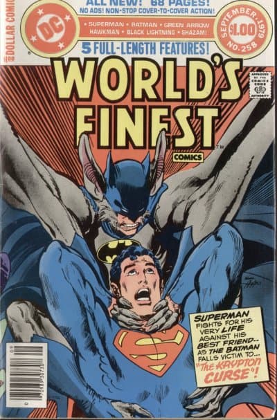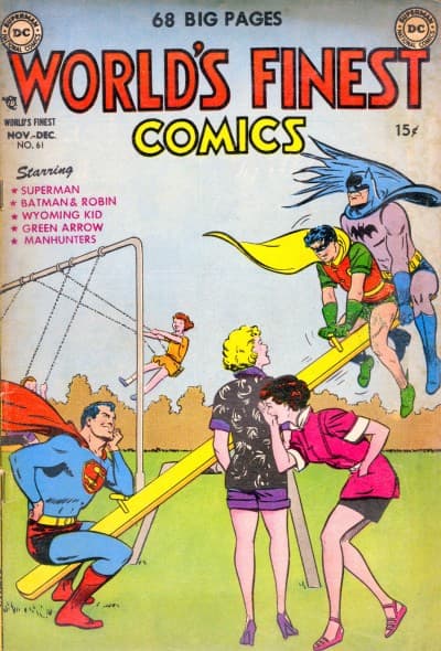 Una portada muy familiar. Es decir, apta para todo público. Por otro lado, se puede ver claramente que Batman y Robin están batallando contra Superman. Además, puedes notar a Superman pasándola bien mientras Batman está teniendo un mal rato al intentar superarlo.