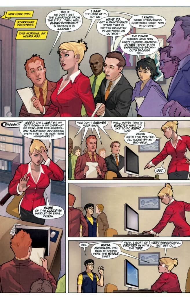 Karen Starr, es el nombre que Power Girl eligió para ocultarse de los humanos a simple vista. Karen es una programadora que aprendió sus conocimientos de computación a través de un tratamiento con el rayo púrpura de Wonder Woman. Como todo programador, por supuesto. Cuando Superman de Earth-Two se retiró, Power Girl tomó su lugar en la Justice Society y generó un profundo vínculo de amistad con Huntress, la hija de Batman y Catwoman.