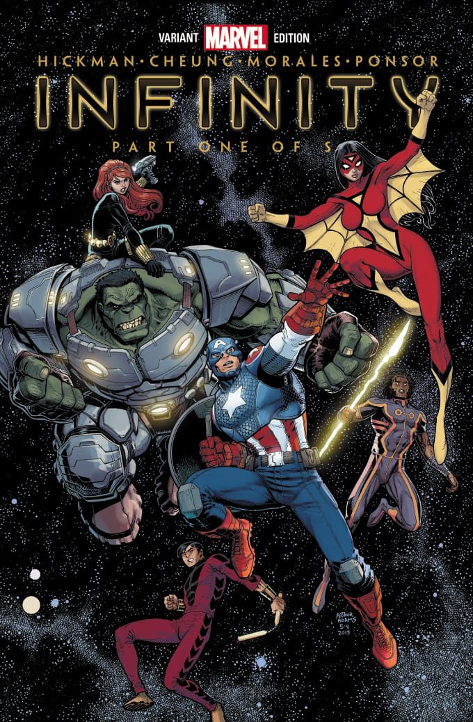 Infinity será el punto de conjunción de dos series que se vienen relacionando progresivamente en el tiempo: Avengers y New Avengers. Mientras que Avengers desarrolla los pormenores del super grupo de héroes reclutando aliados para la gran batalla, New Avengers se enfoca más en la invasión de Thanos al planeta Tierra.