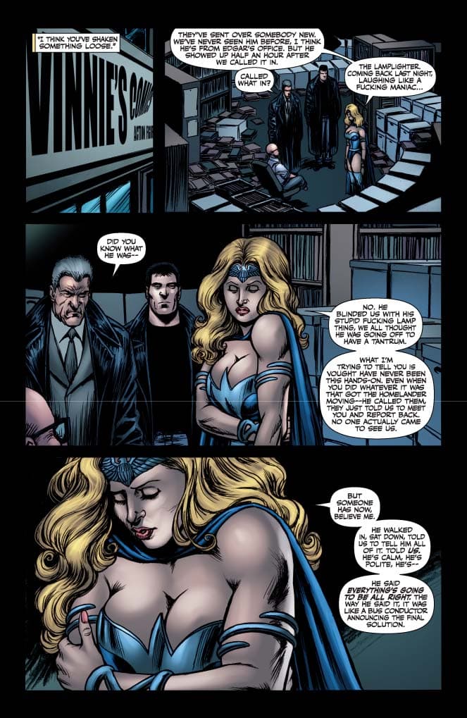 Ennis realmente se ha esforzado para que la historia evolucione más allá del valor shock, y las críticas a la estupidez de los superhéroes y a las corporaciones multinacionales han probado ser demasiado ácidas para algunos. Personalmente les recomiendo que no se dejen ahuyentar por los cobardes y se diviertan de lo lindo con esta historia que solo peca de ser demasiado astuta para su propio bien.