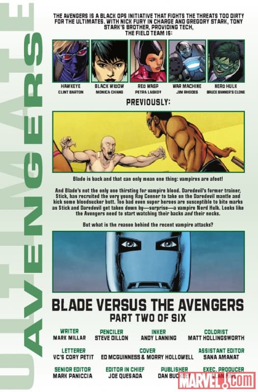 Por eso Millar aprovechó su carta blanca para hacer CUALQUIER COSA que se imaginó con los personajes del universo Ultimate y convirtió al clon cobarde de Hulk y al nuevo Daredevil en vampiros. Para contraatacar los Ultimate Avengers se verán forzados a reclutar al brutal cazavampiros conocido como Blade, quien les enseñará algunas tácticas que incluso ellos considerarán extremas. El resultado promete ser divertido, impredecible y totalmente repleto de momentos shockeantes. No se lo pierdan.