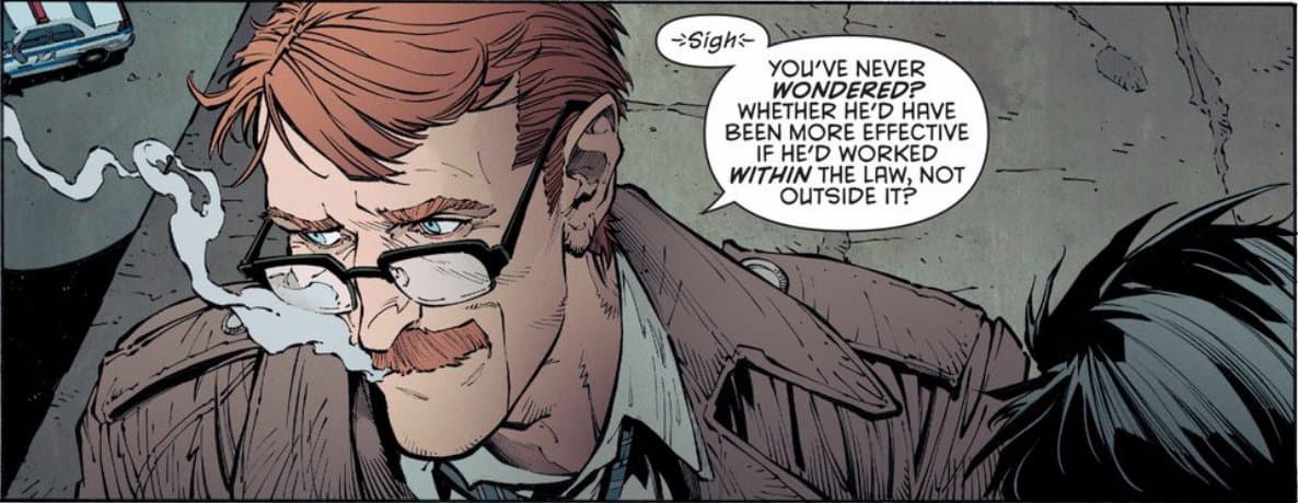 En corto, Bruce Wayne parece estar esfumado y el Joker tampoco se ha aparecido. Ciudad Gótica permanece bajo el reinado del terror y la corrupción, poniendo la idea clara en las calles de que se necesita tener a Batman (algún tipo de Batman, al menos). Esto es elemental en entender que siempre hay que tener a un héroe y siempre se necesita de alguien confiable y dispuesto. Sin embargo, después de todo lo que hemos visto con la "familia" murciélago, el nuevo Caballero de la Noche es quien menos creímos. Se trata del Comisionado Jim Gordon.