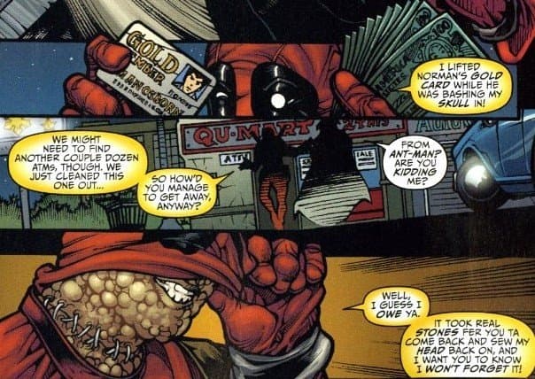 En el especial anual de Deadpool del 2014 el anithéroe convence (por alguna razón) a Thor y a Luke Cage de iniciar un juego de vencidas usándolo como cuerda. Como consecuencia, termina partido por la mitad en partes iguales.
