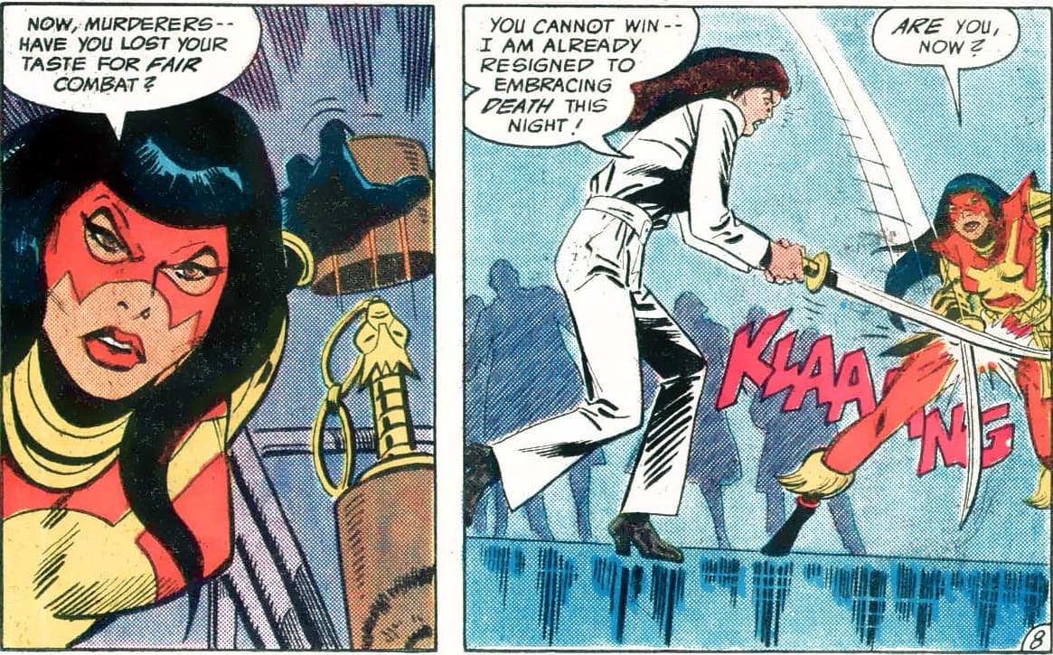 Con esta espada en su poder, Takeo decide retar a duelo a Maseo en su propia casa. Durante la pelea, un accidental incendio se desata y Takeo toma la oportunidad para atravesar a su hermano con su espada mágica. Tatsu, en la confusión, aprovecha para desarmar a Takeo. Es ahí cuando se da cuenta que sus hijos estan atrapados en el fuego y decide intentar rescatarlos. Cuando realizaba los esfuerzos, Tatsu escuchó la voz de su esposo diciéndole que saliera de ahí inmediatamente, lo cual ella hizo, dejando morir a sus hijos. Al poner atención se dará cuenta de que la voz de Maseo venía de la katana con que Takeo lo había matado. Ese espada será conocida como Soultaker, la cual atrapa el alma de quienes mata. Ahora, gracias a las acciones de Takeo, Maseo estaría atrapado para siempre en la espada. Por la injusticia que le había tocado, Tatsu decide entrenar bajo el ala de un anciano sensei para luego ir a Estados Unidos a usar sus habilidades para el bien. Es ahí cuando elige su nombre: Katana.