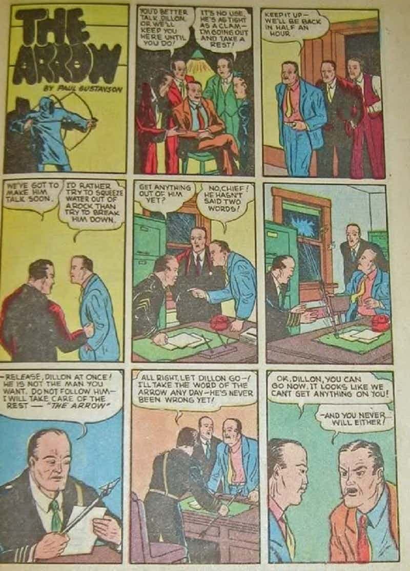 Todo empezó con la primera aparición de Green Arrow en More Fun Comics #73 (septiembre, 1941) de Mort Weisinger y George Papp. Sin embargo, Oliver no fue el primer superhéroe con el nombre Arrow en el título. De hecho, hubo tres antes. El primero se llamó simplemente The Arrow y debutó en las páginas de Centaur Publishing’s Funny Pages poco después del nacimiento de Superman. Este héroe con capucha, arco y flechas fue creado por Paul Gustavson, que luego pasaría a trabajar para Marvel.