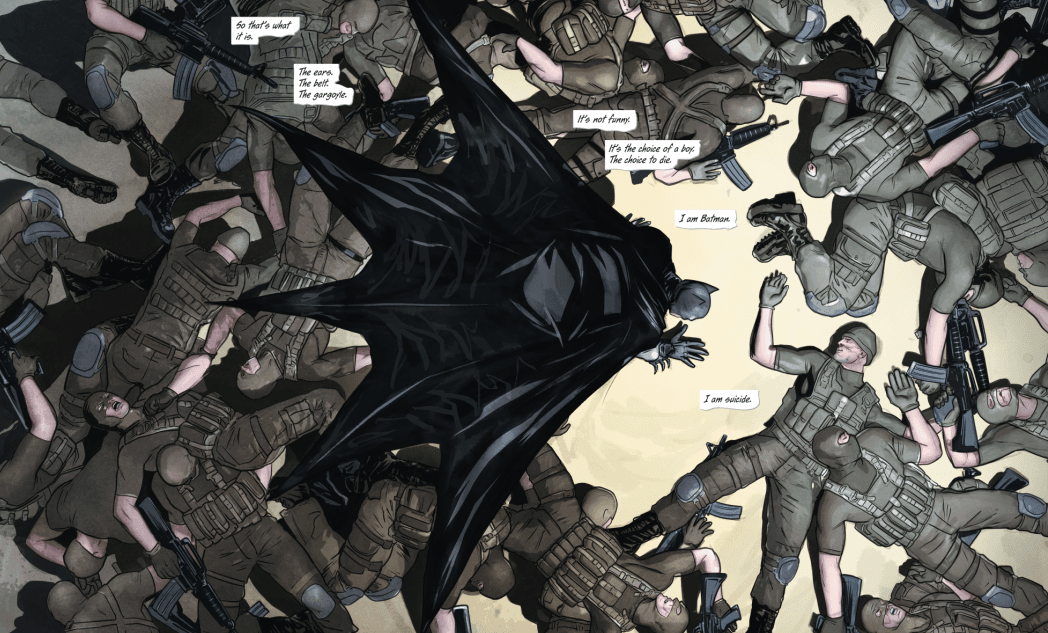 «Tenía 10. Tenía en mis manos una de las navajas de mi padre y me puse de rodillas. Coloqué el metal en mis muñecas. El filo helado, la sangre en mis manos. Miré hacia arriba, hacia mi padre y mi madre, les dije que lo sentía. Lo sentía. (...) Recé, pero nadie escuchó. Y al final, entendí. Amabilidad, dignidad. Dejé la navaja caer y entendí. Me rendí. Mi vida ya no era mi vida. Y susurré (nuevamente): "Juro por el espíritu de mis padres que vengaré su muerte pasando el resto de mi vida combatiendo el crimen" (...) Así es como es. Las orejas, el cinturón, la gárgola. No es gracioso. Es la elección de un niño. La elección de morir. Soy Batman. Soy suicidio.»