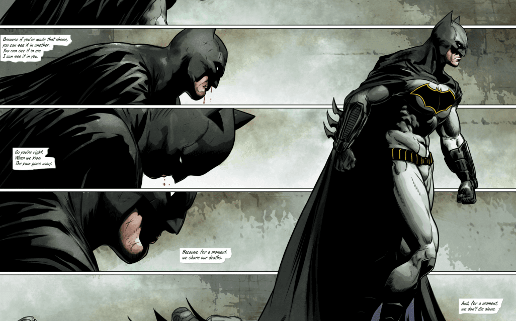El issue termina con una declaración más, casi una confesión de amor, en la que Batman admite que, quien lo acaba de traicionar, sería, posiblemente, la única persona capaz de entender su muerte y su vida. En sus propias palabras: «Así que tienes razón. Cuando nos besamos, el dolor desaparece. Porque, por un momento, compartimos nuestras muertes; y por un momento, no morimos solos».