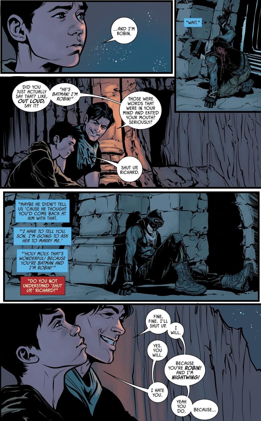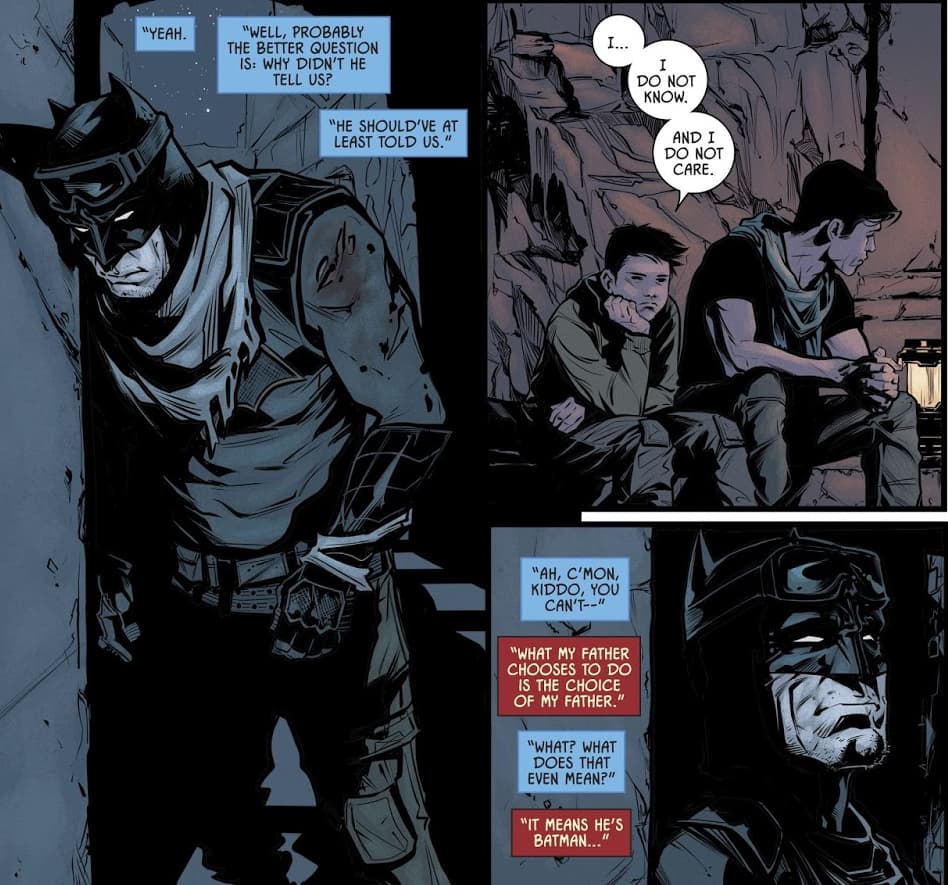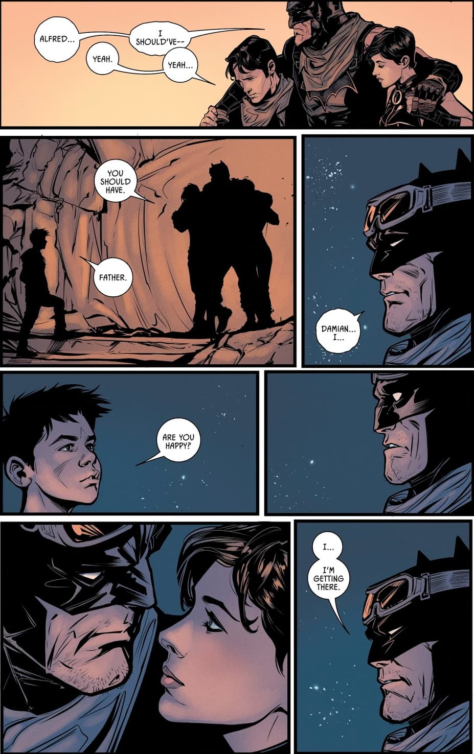 En las afueras de la ciudad, Damian y Dick Grayson aguardaban por el regreso de su padre. Ambos trataban de entender la razón detrás de la incursión mortal, siendo Nightwing el único capaz de entender la mente del Murciélago: «Él no es feliz, pero ahora quiere serlo». Lo cual es coherente si tomamos en cuenta las palabras que Thomas Wayne le dijo a su hijo en Batman #22, cuando ambos se encontraron en la línea temporal de Flashpoint: