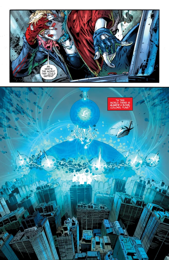Para los que vieron la película (o el tráiler), esto resultará familiar. Un dispositivo genera una especie de portal (en las palabras de Harley: «Luces bonitas»), responsable de todos los males que azotan a la ciudad... y una explosión acaba con la amenaza.