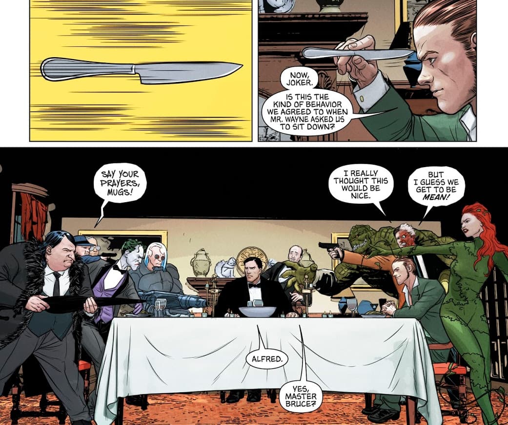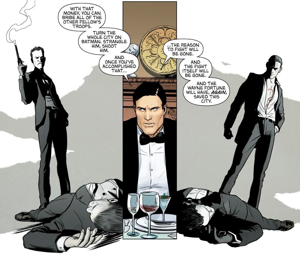 La estrategia consiste en reunir ambos bandos durante una cena en la Mansión Wayne con el fin de hacer entrar en razón a sus líderes. A medida que los diferentes platos se servían, el señor Wayne abogaba por su ciudad; primeramente, tratando de que Riddler y Joker apaciguaran su animosidad, y luego mencionando que el verdadero problema siempre ha sido Batman, y solo su muerte podría saciar su sed de guerra. Pero Bruce no se detiene allí, él ofrecera su ayuda al bando que lo convenza; él mismo participará en el asesinato de Batman si esto detiene la matanza en Gotham. ¿Pero cómo?
