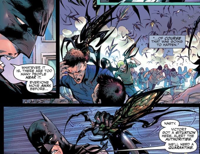 Casi al final del issue, Batman descubre que una criatura extraña (similar a un insecto) está atacando a la población y provocando una infección masiva.
