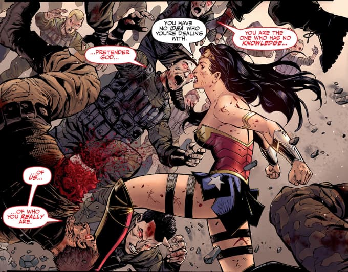 Tras darles una pacífica paliza, Wonder Woman se ve involucrada en un terremoto que mata a gran parte de los terroristas, aunque, curiosamente, aquel sismo no fue provocado por ella.