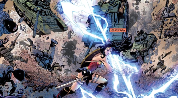 En el comienzo del issue, y con un arte magnífico, podemos contemplar a Diana en toda su fuerza, mientras trata de reducir a un grupo de terroristas rusos en lo que sería una "misión de paz".