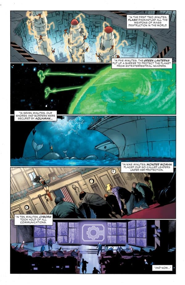 «En los primeros dos minutos, Flash desmanteló todas las armas de destrucción masiva; en cinco minutos, los Linterna Verde levantaron una barrera que protegería el planeta de cualquier invasión posible; en siete minutos, nuestras costas y barreras fueron aseguradas por Aquaman; en nueve minutos, Wonder Woman ubicó a nuestros líderes bajo su protección; y en diez minutos, Cyborg tomó control sobre todas las comunicaciones. Y ahora...»