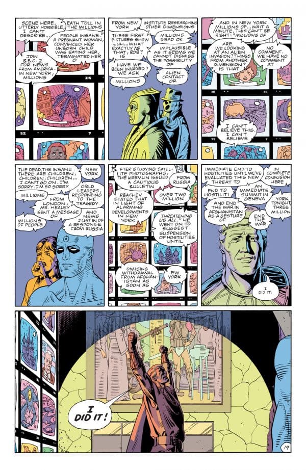 Tras engañar al mundo entero, Ozymandias recibe la noticia de el curso de los eventos en la Tierra ha cambiado gracias a su influencia. Sus atrocidades y todas las vidas que sacrificó sin pestañear, han logrado una "paz duradera"; todo valió la pena. Emocionado por esto, Ozymandias grita: ¡Lo hice! ¡Lo hice!
