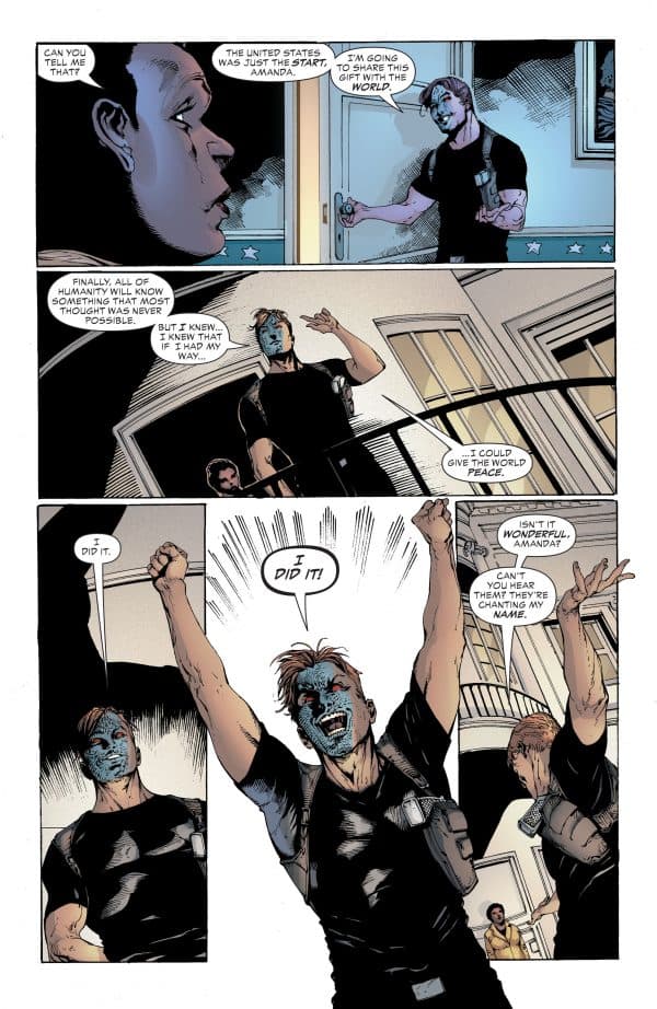 Unos issues más tarde, Maxwell logra lo imposible: controlar a la mayoría de los superhéroes miembros de la Liga de la Justicia; y tal como veremos en la página a continuación, dominar el mundo con su poder.